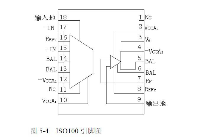 由于環(huán)境試驗(yàn)箱的工作環(huán)境十分惡劣,因此輸入通道的各個(gè)環(huán)節(jié)中存在各種電磁干擾以及共模干擾等不良因素,會(huì)造成測(cè)量信號(hào)嚴(yán)重失真,系統(tǒng)不穩(wěn)定等后果。特別是存在強(qiáng)電干擾時(shí)會(huì)直接影響系統(tǒng)的安全。為此,在輸入通道中常常采用信號(hào)隔離措施。常用的方法是采用隔離放大器。這是因?yàn)楦綦x放大器的線性和穩(wěn)定性好,隔離電壓和共模抑制比高,應(yīng)用電路簡(jiǎn)單,頻帶較寬等。本設(shè)計(jì)中采用了ISO100光耦合隔離放大器保證前向通道的信號(hào)傳輸質(zhì)量ISO100 是一種小型廉價(jià)的光耦合隔離放大器。其工作電源為±18V,隔離電壓2500V,輸入電流為±1mA,頻帶寬達(dá)60kHz,為18 引腳DIP 組件。引腳圖如圖5-4 所示: